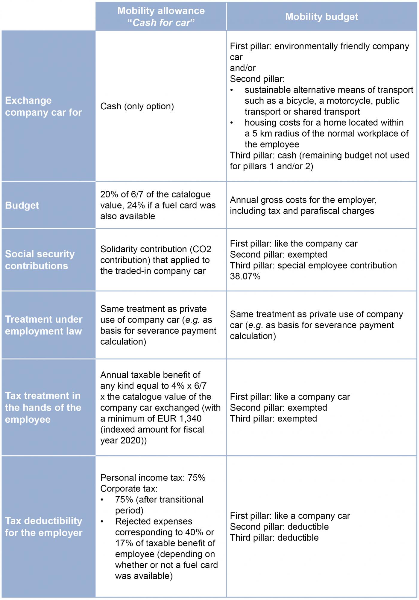 The mobility budget was introduced with effect from 1 March 2019. It allows an employee, under certain conditions, to exchange his company car for a budget that he can spend on various mobility solutions, with payment in cash of the remaining budget. The mobility allowance or "cash for car" scheme introduced in 2018 (see Eubelius Spotlights June 2018) will also continue to apply. Here we present an overview table showing the main differences between these two alternatives to the traditional company car.