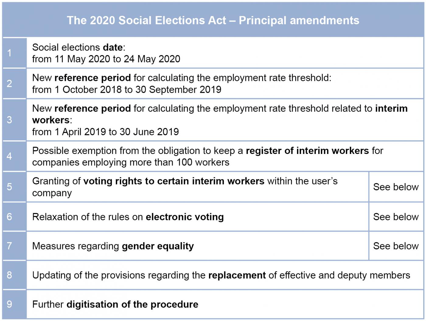 Initially, the National Labour Council (NLC) had suggested that periods worked as an interim worker within the user's organisation should be counted towards the requirement of seniority in the company for voting eligibility purposes, in cases where such interim work was immediately followed by the worker entering into an employment agreement with the user (see Eubelius Spotlights March 2019). In the end, the legislator went a step further: The 2020 Social Elections Act allows interim workers who have been employed within the user's organisation for a certain length of time to participate in the social elections in the user's organisation in their capacity as interim workers. Some highly technical conditions have been established in this regard.