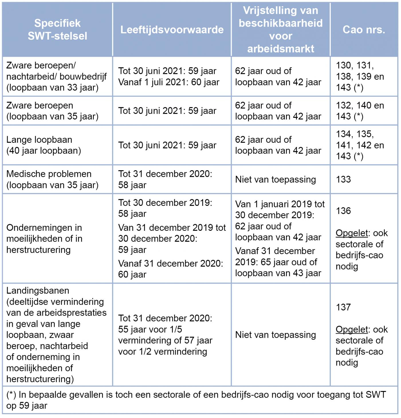 De leeftijdsgrens voor het algemene stelsel van werkloosheid met bedrijfstoeslag is vastgesteld op 62 jaar. Cao's kunnen voorzien in specifieke stelsels (met lagere leeftijd) en de vrijstelling van aangepaste beschikbaarheid voor de arbeidsmarkt regelen.
